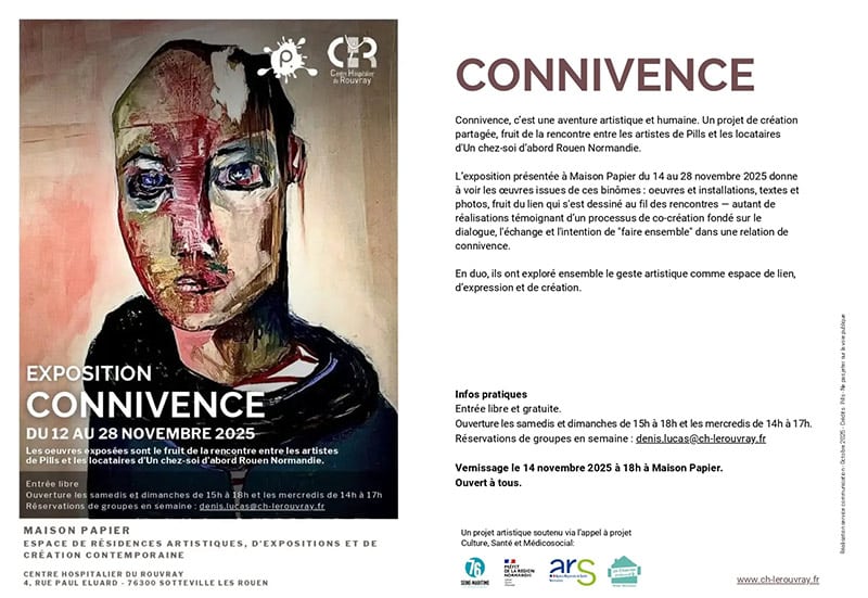 Nous avons le plaisir de vous convier au vernissage de l’exposition Connivence le Vendredi 14 Novembre 2025 à 18h00 à Maison Papier au Centre Hospitalier du Rouvray.